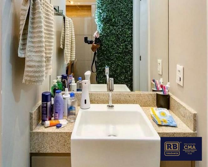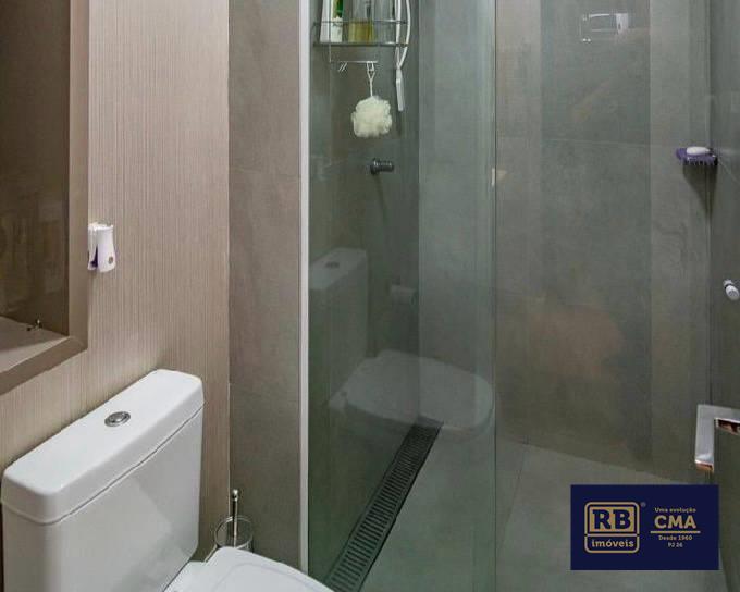 1 quarto com piso em vinílico de madeira, armários planejados, sendo a suíte com bancada em granito, pia em cuba de apoio, espelho, armários planejados e box em blindex