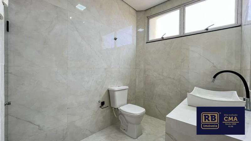 Banheiro social amplo com pia em cuba de apoio, iluminação planejada e box em blindex