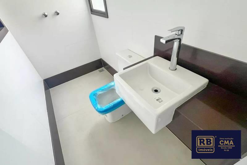 Banheiros (social e suíte) revestidos em porcelanato, com materiais de qualidade.