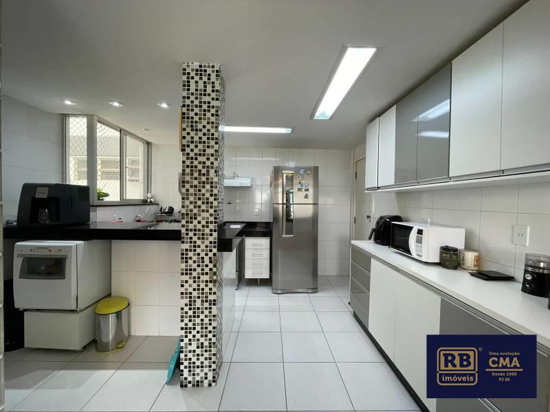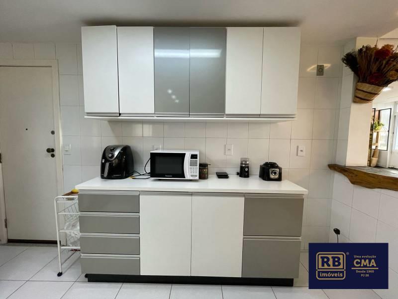 Cozinha aberta, equipada com armários planejados e bancada em granito.