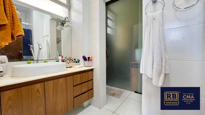 Banheiro social com bancada em granito, espelho, armários e box em blindex
