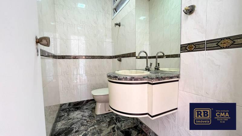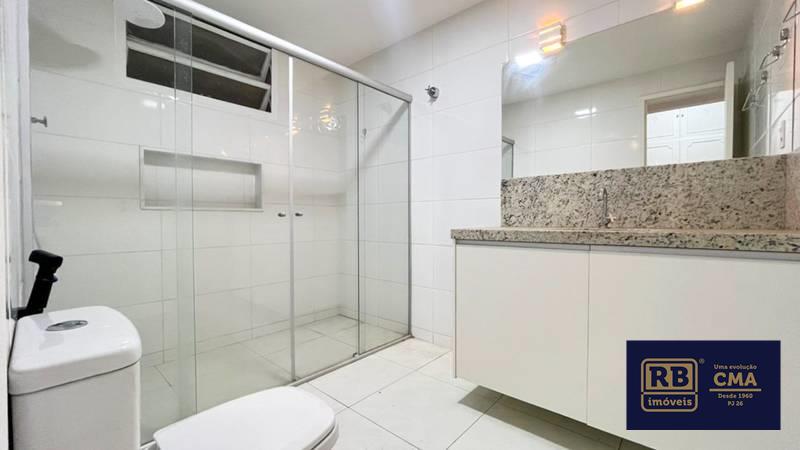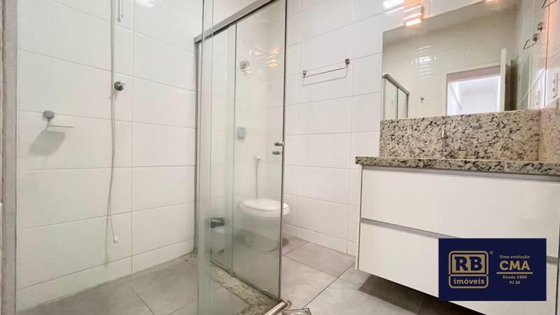Banheiro social amplo com bancada em granito, espelho, armários planejados e box em blindex