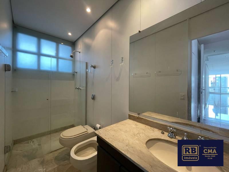 1 quarto amplo com piso em madeira envernizada, armários e iluminação planejados, teto com rebaixamento em gesso, sendo a suíte sofisticada, com revestimento em mármore, box em blindex com vidro transparente, banheira retangular embutida, bancada com pia em cuba de apoio e bidê